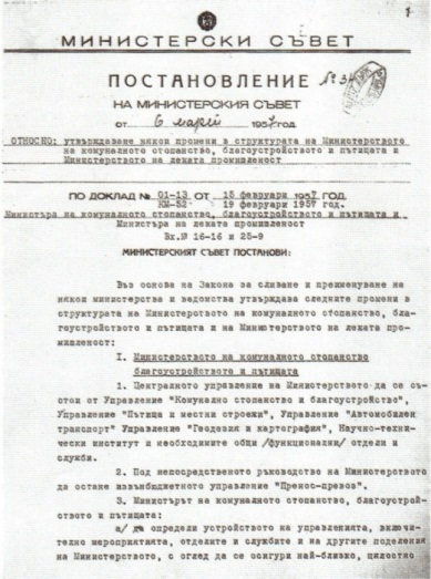 С Постановление №34 на ЦК на БКП и Министерския съвет се създава Научно-технически институт към Министерство на комуналното стопанство, благоустройството и пътищата.